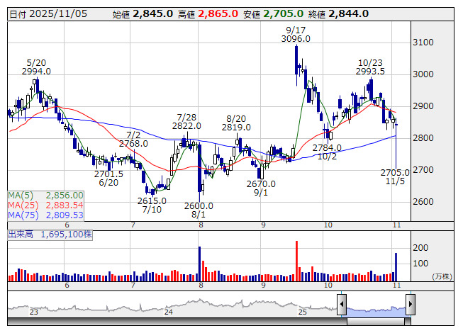 カルビー <日足> 「株探」多機能チャートより11月5日に、株主優待制度について発表した銘柄を取り上げた。