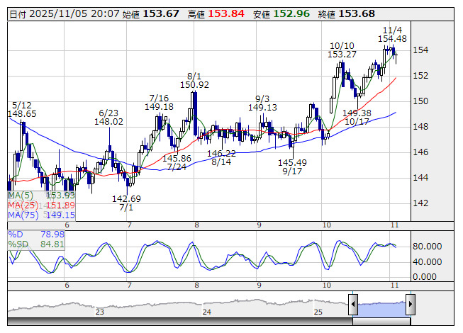 米ドル/円 <日足> Slowストキャス 「株探」多機能チャートより欧州市場でドル・円は伸び悩み、153円83銭まで上昇後は153円70銭付近に値を下げた。米10年債利回りの上昇は一服し、ドル買いは抑制されたもよう。一方、欧州株式市場はマイナスが目立ち、円売りは後退。材料が乏しい中、上値の重さが目立つ。