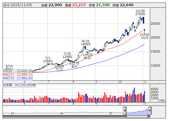 レーザーテク <6920> 30,440 +1,800 ( +6.3%) 115,000 (350,175) 112,800 (343,363)