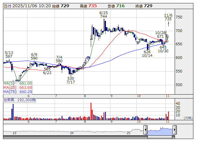 国際計測 <日足> 「株探」多機能チャートより売上高予想は従来の見通しから10億円増額して140億円(同6.0%増)に見直した。また、期末配当予想を5円増額して25円とした。年間配当予想は35円(前期比5円増配)となる。9月中間期はアジアのタイヤメーカーを中心としてバランシングマシンの売り上げが増加し、業績が想定を上振れして着地する。第3四半期(10~12月)以降も、バランシングマシンを中心に製品の売り上げを見込み、業績予想を修正した。