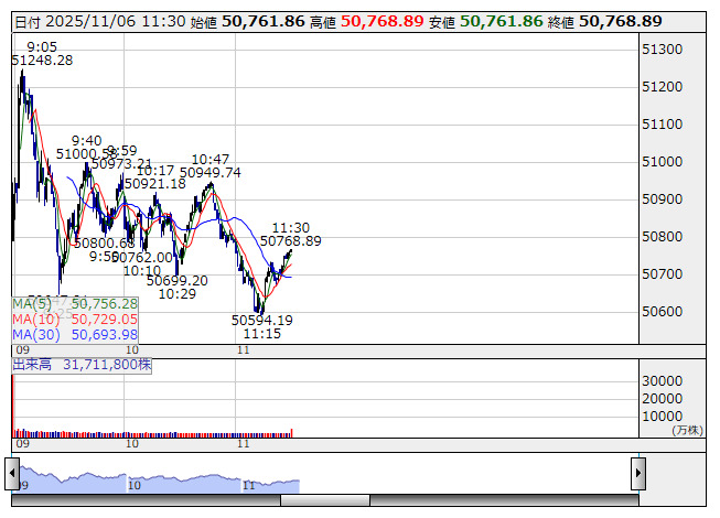 【市況】日経平均6日前引け=3日ぶり反発、556円高の5万768円