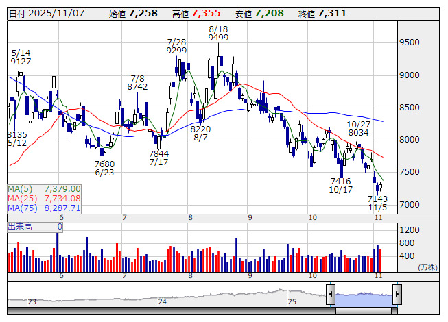 リクルート <日足> 「株探」多機能チャートより11月7日9時03分33秒現在、特別買い気配は25銘柄、特別売り気配は57銘柄となっている。
