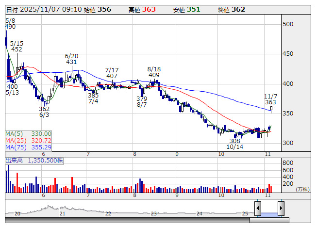 4477>がカイ気配スタート、にわかに底値圏から浮上気配をみせている。個人や小規模事業者を対象としたECプラットフォーム「BASE」を運営するほか、Webサービスにオンライン決済を導入できる「PAY.JP」の提供などを主力としている。M&A戦略に積極的で加速度的に業容を拡大させており、トップラインの伸びが注目される。そうしたなか、6日取引終了後に25年12月期業績予想の修正を発表、売上高は従来予想の196億円から208億3600万円(前期比30%増)に、営業利益は10億円から11億7900万円(同53%増)に増額した。更に株主還元も強化し、今期の年間配当について無配を計画していたが、これを改め初の4円配当を実施することを併せて発表した。これをポジティブ視する買いを呼び込んでいる。