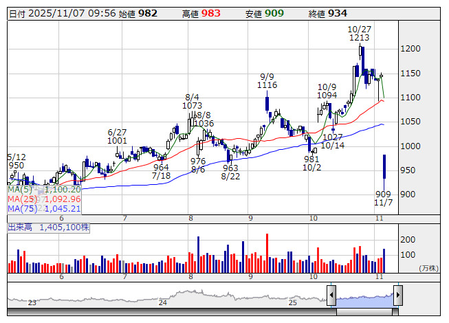 2025年11月07日09時46分 【材料】カナデビアは急落、従来予想から一転営業減益に下方修正 カナデビア <日足> 「株探」多機能チャートより カナデビア<7004>は急落。6日取引終了後、26年3月期連結業績予想について売上高を据え置く一方、営業利益を270億円から180億円(前期比33.2%減)へ下方修正すると発表した。環境部門と機械・インフラ部門でコストアップやトラブルに伴う悪化が見込まれるという。従来の増益予想から一転して大幅減益に陥るとともに、8期ぶり減益となる見通しを示したことから、これを嫌気した売りが強まっている。 出所:MINKABU PRESS