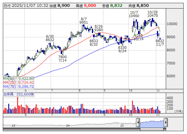日製鋼 <日足> 「株探」多機能チャートより■財務省 : 11月7日受付