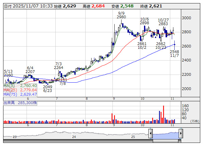 リョービ <日足> 「株探」多機能チャートより■財務省 : 11月7日受付