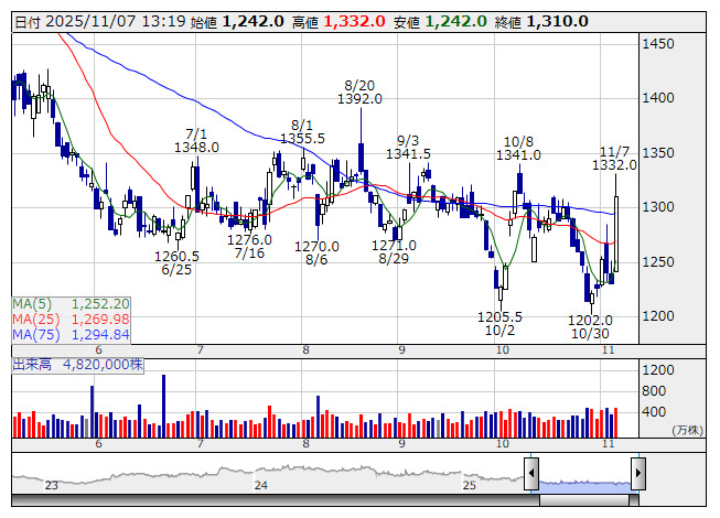 2801>が後場に入り急動意、8%を超える上昇で1330円台まで水準を切り上げる場面があった。醤油メーカー最大手だが、北米が収益の主柱で海外売上比率が8割近くに達している。また、豆乳飲料も展開しており、積極的な宣伝活動も奏功して好調に売り上げを伸ばしている。7日前場取引終了後に発表した25年4~9月期の営業利益は前年同期比6%減の396億3300万円となったが、上期の減益決算は織り込み済みであったほか、7~9月期でみると同利益は前年同期比微増ながら増益で着地したことがポジティブ視されたようだ。なお、26年3月期の営業利益は前期比2%増の750億円を見込んでいる。足もとで株式市場では、AI関連や半導体関連などバリュエーション面で高めに買われていた銘柄の調整が入る流れにあり、食品セクターで安定した業績を維持する同社株のようなディフェンシブ性の高い銘柄に資金シフトの動きが観測される。