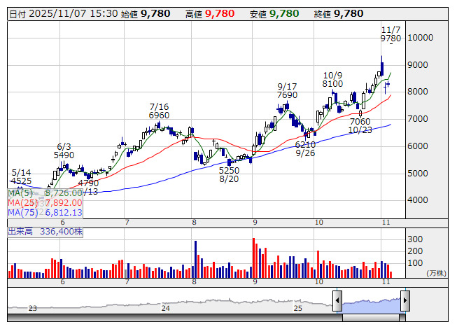 フルヤ金属<7826>が続急騰。6日の取引終了後に、26年6月期の連結業績予想について、売上高を550億円から640億円(前期比11.5%増)へ、営業利益を75億円から100億円(同4.8%増)へ、純利益を48億円から60億円(同7.2%減)へ上方修正し、あわせて期末一括配当予想を60円から75円へ引き上げたことが好感された。データセンター需要を主因に電子部門、薄膜部門が順調に推移することが見込まれていることに加えて、サプライチェーン支援部門などで予想を上回る見通しになったことが要因としている。なお、同時に発表した第1四半期(7~9月)決算は、売上高232億100万円(前年同期比66.9%増)、営業利益34億1000万円(同23.1%増)、純利益23億2800万円(同43.1%増)だった。