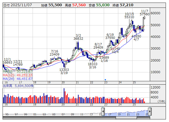 ファストリ <月足> 「株探」多機能チャートより今週の日経平均株価は、米ハイテク株安を受け値がさ半導体関連株を中心に売りが優勢となり、前週末比2134円安の5万0276円と3週ぶりに反落した。相場全体が下落するなか、逆行高で上場来高値を更新した銘柄は89社だった。上場来高値を更新した銘柄は過去の売買による抵抗帯がなく、いわゆる“株価青天井”銘柄として注目される。
