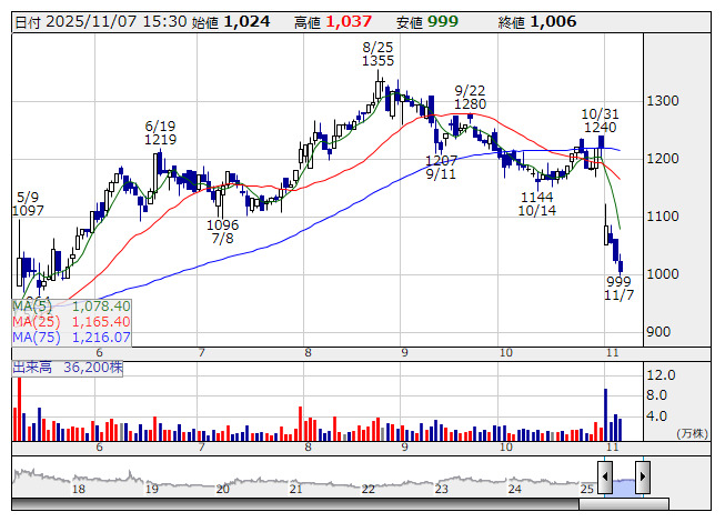 ファイズHD <日足> 「株探」多機能チャートより―決算で売られた銘柄! 下落率ランキング―