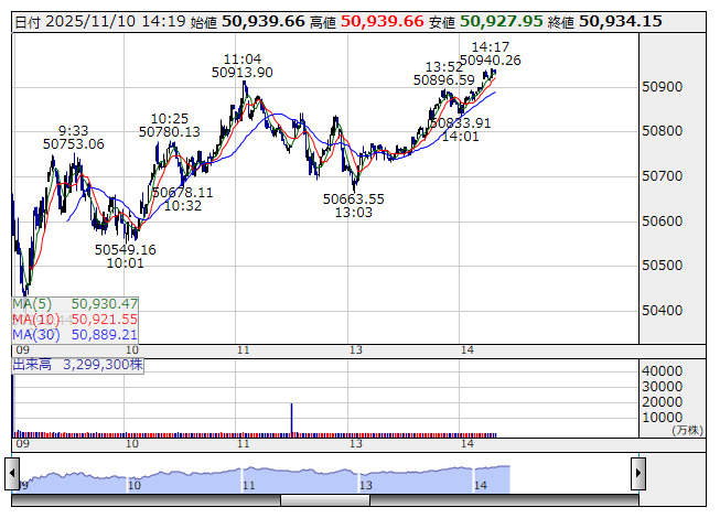 日経平均 <1分足> 「株探」多機能チャートより日経平均ボラティリティー・インデックス(投資家が将来の市場変動の大きさをどう想定しているかを表した指数)は14時15分現在、前日比-2.32(低下率6.53%)の33.19と低下している。なお、今日ここまでの高値は34.79、安値は33.17。