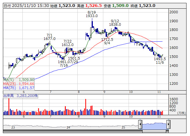 サイバー <日足> 「株探」多機能チャートより■財務省 : 11月10日受付