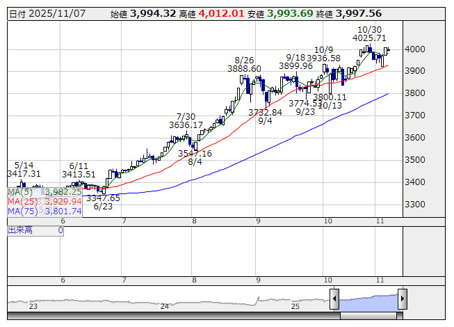 2025年11月10日16時44分 【市況】10日中国・上海総合指数=終値4018.5972(+21.0415) 上海総合 <日足> 「株探」多機能チャートより 10日の中国・上海総合指数の終値は前営業日比21.0415ポイント高の4018.5972と反発。 出所:MINKABU PRESS