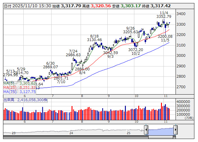 TOPIX <日足> 「株探」多機能チャートより日本取引所が公表した先物手口情報によると、11月10日のTOPIX先物期近(2025年12月限)の日中取引(立会内・J-NETの合算)で、取引高トップはABNクリアリン証券の2万1722枚だった。