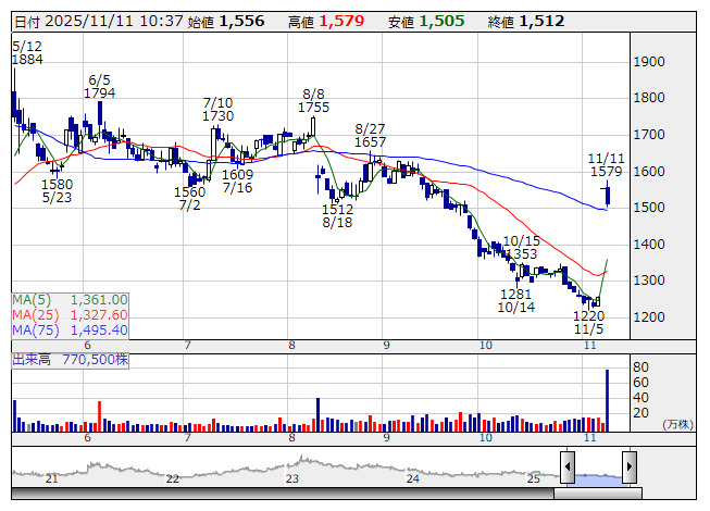 ■出来高変化率上位 [11月11日 10:32 現在]