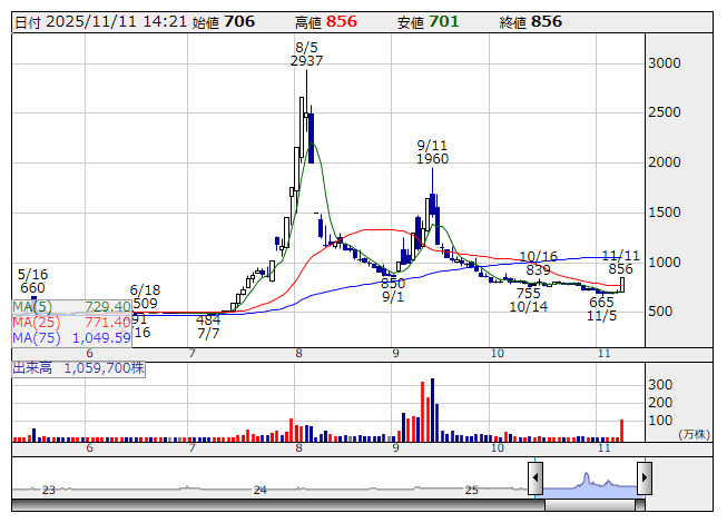 イメージ情報 <日足> 「株探」多機能チャートより※出来高変化率ランキングでは、直近5日平均の出来高と配信当日の出来高を比較することで、物色の傾向など市場参加者の関心を知ることができます。