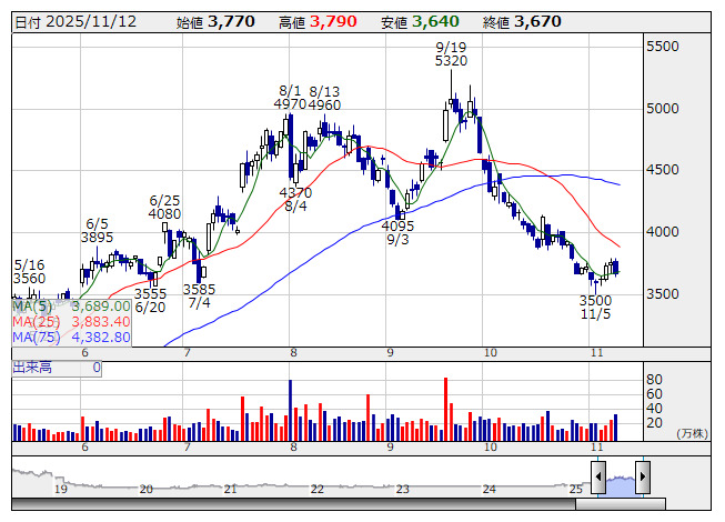 7806>に物色人気集中、カイ気配スタートで急反騰しフシ目の4000円大台復帰をうかがう展開となっている。美容、健康関連機器の開発・販売を手掛けるファブレスメーカーで足もとの業績は絶好調に推移している。11日取引終了後、25年9月期の決算を発表、営業利益は前の期比3.3倍となる106億6500万円と急拡大し過去最高利益を大幅に更新した。また、26年9月期についても収益拡大基調に陰りはみられず、同利益は前期比22%増の130億円と大幅増益で連続過去最高更新を見込む。好業績を背景に株主還元も強化し、前期年間配当を従来計画に7円増額となる25円(前の期実績は13円)としたほか、今期は更に5円増配となる30円を計画しており、これも株価を強く刺激する格好となっている。