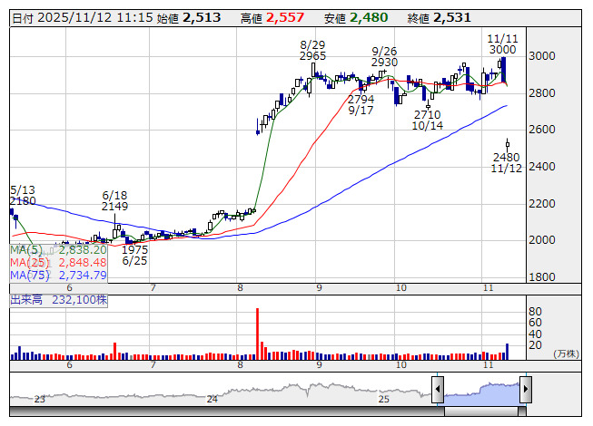 日本化 <日足> 「株探」多機能チャートよりこの日の東京株式市場で日本化は大幅安。同社が11日取引終了後に発表した上期(4~9月)連結決算は増収減益となった。電子セラミック材料が車載向けと通信向けで増加し、売上高は増加。一方、利益面では電池材料における原材料市況価格の変動と販売価格への転嫁にタイムラグが生じたことや、前年度に発生した棚卸資産の評価損の減少効果が剥落したことなどが影響した。