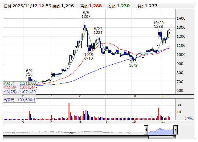 2025年11月12日12時54分 【テク】ETSグループ---直近戻り高値に顔合わせ ETS・G <日足> 「株探」多機能チャートより <253A> ETSグループ 1277 +10 続伸。一時1288円かで買われ、10月30日につけた直近戻り高値に顔合わせした。ボリンジャーバンドは上向きで推移しており、10月30日時点では+3σを上抜けて過熱感が警戒されていたが、現在はようやく+2σを捉えてきたところである。なお+3σは1368円まで切り上がってきている。8月高値1397円が射程に入ってきた。 《FA》 提供:フィスコ