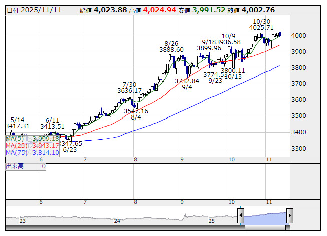 2025年11月12日16時59分 【市況】12日中国・上海総合指数=終値4000.1396(-2.6180) 上海総合 <日足> 「株探」多機能チャートより 12日の中国・上海総合指数の終値は前営業日比2.6180ポイント安の4000.1396と小幅続落。 出所:MINKABU PRESS