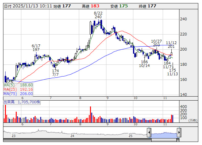 LIFULL <日足> 「株探」多機能チャートより広告宣伝費や営業強化、AI・プロダクト開発などの戦略投資が利益を押し下げる。配当予想は非開示(前期10円41銭)としたが、配当性向30%を基準に実施する予定という。同時に発表した25年9月期決算は売上高が281億2700万円(前の期比6.9%増)、営業利益が38億1500万円(同26.1%増)だった。