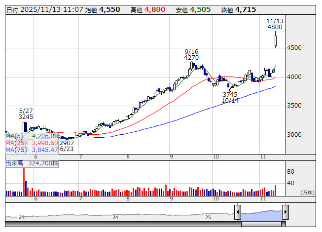 7242>は急伸。12日取引終了後、26年3月期連結業績予想について売上高を4400億円から4600億円(前期比4.9%増)へ、営業利益を225億円から310億円(同36.7%増)へ上方修正すると発表した。需要が想定を上回り堅調なことや為替が円安に推移していることが要因。米国の関税措置による影響額や最新の市場見通しも織り込んだ。配当予想も120円から150円(前期は株式分割考慮ベースで110円)に増額した。これを好感した買いが集まっている。