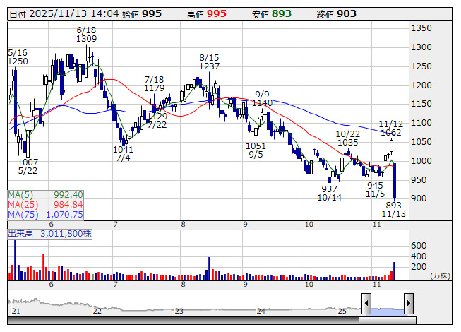 急落。25年9月期の売上高は133.96億円(前年同期比21.9%増)、経常利益は13.80億円(同648.6%増)と大幅増収増益だった。顧客体験向上やデータ活用に企業の関心が高まり、CX(顧客体験)プラットフォーム「KARTE」はウェブサイトやスマートフォンアプリ上のマーケティング領域に留まらず、カスタマーサポート領域などの企業活動に活用されている。今後も「KARTE」の機能強化やプロダクト提供を通じ企業が統合的にユーザーを理解できるデータ環境拡充を進めていくとしている。