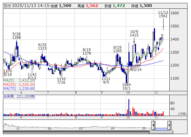 T&S・G <日足> 「株探」多機能チャートよりティアンドエスグループ<4055>は12日、2025年9月期連結決算を発表した。売上高は前期比37.7%増の41.03億円、営業利益は同45.5%増の7.56億円、経常利益は同44.8%増の7.53億円、親会社株主に帰属する当期純利益は同58.5%増の5.09億円となった。