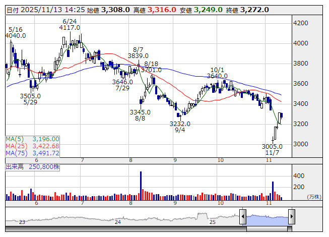 カドカワ <日足> 「株探」多機能チャートより■財務省 : 11月13日受付
