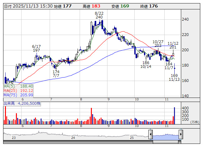 2120>は大幅反落。前日に25年9月期の決算を発表、営業利益は38.2億円で前期比26.1%増となり、従来予想の33億円を上振れる着地に。年間配当金も7.33円から10.41円に引き上げている。一方、26年9月期は30億円で同21.4%の減益見通しとしており、売り材料視されているようだ。広告宣伝費・営業費など先行投資の増加を見込んでいる。新たにスタートする新中計の達成に向けたスタートダッシュの1年と位置付けているもよう。