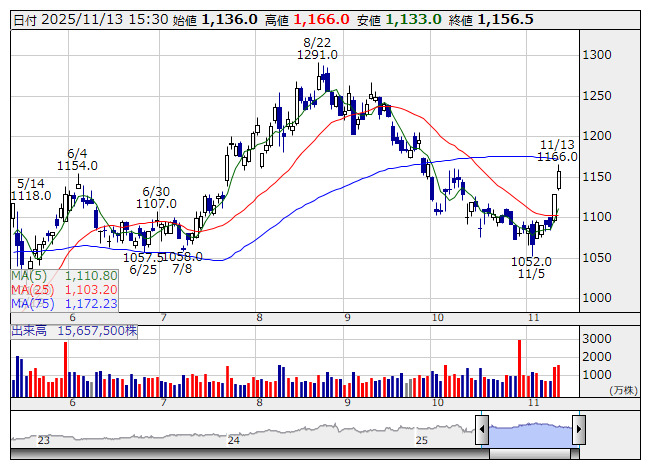 <5702> 大紀アルミニウム工業所 1088 -69 ( -6.0%) 1132.0 1138.4