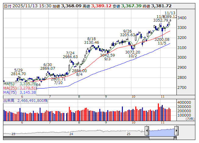 TOPIX <日足> 「株探」多機能チャートより日本取引所が公表した先物手口情報によると、11月13日のTOPIX先物期近(2025年12月限)の夜間取引(立会内・J-NETの合算)で、取引高トップはABNクリアリン証券の8572枚だった。