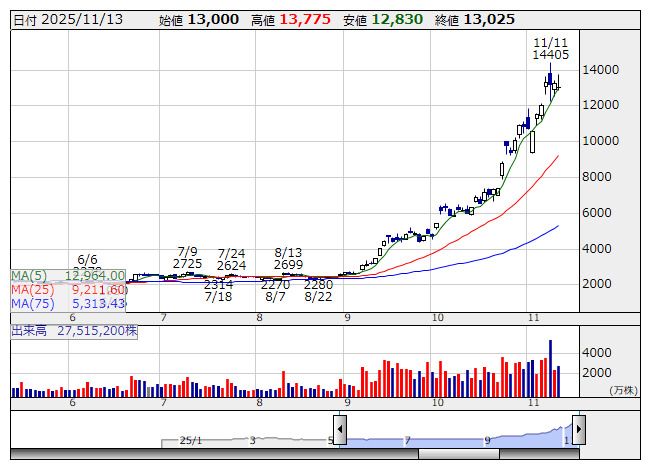 285A>が急落。下落率は一時20%を超えた。13日の取引終了後、26年3月期第2四半期累計(4~9月)の連結決算を発表。売上高は前年同期比13.0%減の7911億4500万円、最終利益は前年同期比66.5%減の589億4600万円だった。7~9月期の売上高は4483億円(同6.8%減)、最終利益は407億円(同61.7%減)だった。決算内容を嫌気した売りが膨らんでいる。第1四半期(4~6月)との比較では出荷量の増加を背景に、借入金の返済に伴う金融費用の増加などがありながらも増収・最終増益だった。