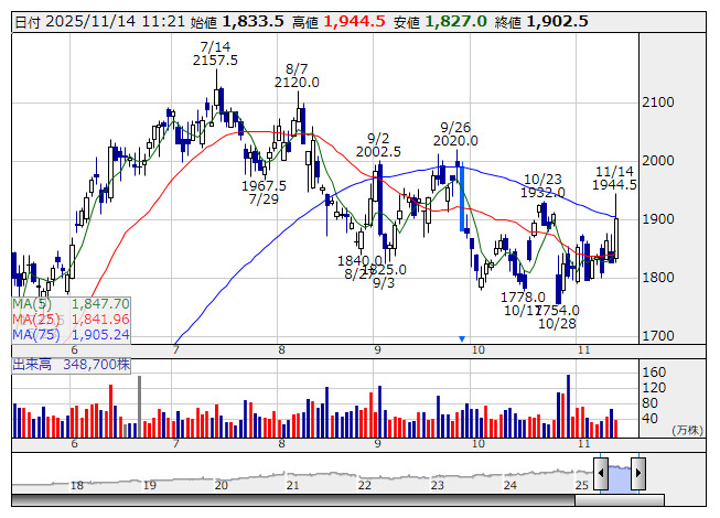Jエレベータ <日足> 「株探」多機能チャートより保守・保全の新規契約の増加による保守・保全売上高の増加に加えて、リニューアル売上高が従来予想を上回る水準で推移する見込みであることが要因という。なお、9月中間期決算は、売上高269億1200万円(前年同期比15.7%増)、営業利益51億3100万円(同30.7%増)、純利益32億9100万円(同30.5%増)だった。