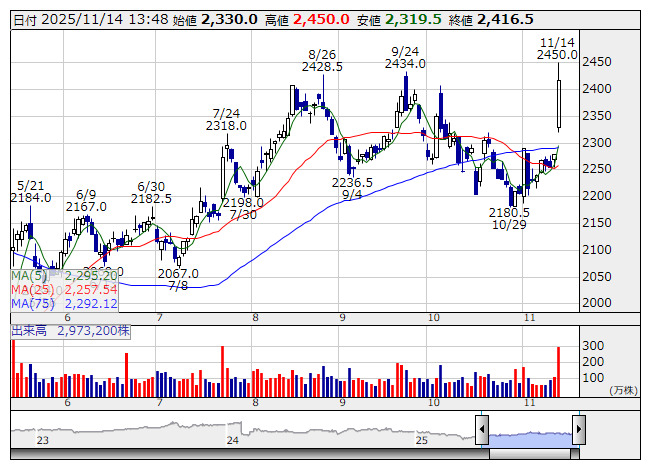 2025年11月14日13時48分 【材料】あおぞら---大幅続伸、上半期進捗率は62%と順調な水準に あおぞら銀 <日足> 「株探」多機能チャートより あおぞら<8304>は大幅続伸。前日に上半期の決算を発表、純利益は136億円で前年同期比14.2%増となり、据え置きの通期計画220億円、前期比7.2%増に対する進捗率は62%の水準となっている。与信費用などは増加しているが、非金利収入が全般的に好調推移。利上げに伴って国内資金利益も増益となっている。サプライズは限定的と言えるが、順調な決算内容をポジティブ評価する動きが先行へ。 《ST》 提供:フィスコ