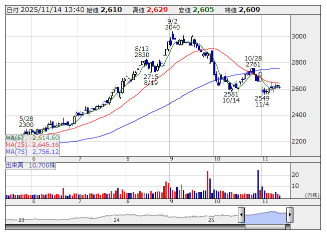 椿本興 <日足> 「株探」多機能チャートより椿本興業<8052>の株価は、一段高が期待される。今中期経営計画は前倒し達成されており、創業110周年の2026年が初年度となる次期中期経営計画では、売上高1,500億円が目指されることになる。上昇傾向にある利益率を保守的に見積もって変化なしとした場合でも、次期中期経営計画の最終年度におけるPER15倍は時価総額で800億円(株価で4,100円)を上回る(現在、時価総額で510億円、株価で2,617円)。配当利回りも3%強。
