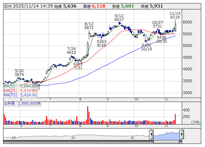 5101>は後場動意。上昇率は一時6%を超え、上場来高値を更新した。同社は14日午後2時、25年12月期第3四半期累計(1~9月)の連結決算を発表。売上高は前年同期比12.0%増の8771億8900万円、営業利益は同6.9%増の916億5700万円、最終利益は同8.7%増の661億2400万円となった。第3四半期(7~9月)の営業利益は前年同期比約25%増と大幅増益で、売上高、最終利益とともに7~9月期として過去最高となった。タイヤ事業で国内向けや北米のSUV・CUVを中心とした新規納入が増加した。販売価格の見直しも寄与して関税によるマイナスの影響をはねのける形となり、評価した買いを誘ったようだ。