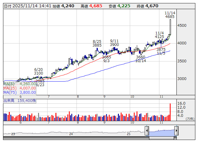 8345>が後場急騰し、年初来高値を連日更新している。14日午後2時ごろ、26年3月期第2四半期累計(4~9月)の連結決算を発表した。経常収益が319億8400万円(前年同期比34.7%増)、最終利益が43億5800万円(同39.5%増)だった。同時に株主還元方針の変更を開示しており、今後は累進的配当を導入し、配当性向は40%以上(変更前は30%を目安)とする。年間配当予想は中間・期末各67円50銭の年135円から中間・期末各96円の年192円(前期は125円)に増額した。業況と株主還元姿勢を評価した買いが集まっている。9月中間期は貸出金利息や有価証券利息配当金など資金運用収益が増加した。