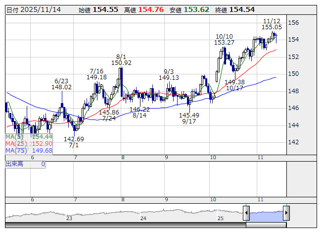 米ドル/円 <日足> 「株探」多機能チャートより14日のニューヨーク外為市場でドル・円は153円62銭まで下落後、154円74銭まで上昇し、154円54銭で引けた。世界株安でリスク回避の円買いや質への逃避の米国債買いに長期金利が低下し、ドル売りが優勢となった。その後、警戒感が後退し円の売り戻しが強まったほか、米金利上昇でドル買い戻しが強まった。