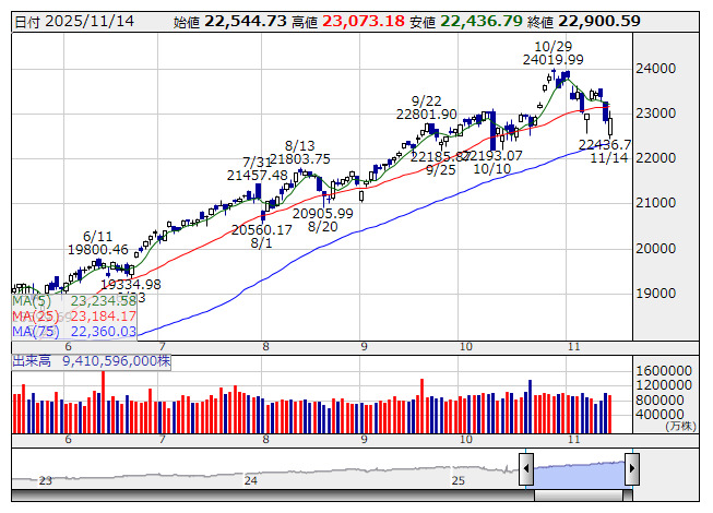 14日のNY市場はまちまち。ダウ平均309.74ドル安の47147.48ドル、ナスダックは30.23ポイント高の22900.59で取引を終了した。人工知能(AI)バブル懸念に利益確定売りが継続し、寄り付き後、下落。利下げ期待の後退も更なる売り材料となり、続落した。その後、値ごろ感からハイテクが買い戻され、ナスダックは上昇に転じた。ダウも下げ幅を縮小しまちまちで終了。セクター別ではエネルギーやソフトウェア・サービスが上昇、ヘルスケア機器・サービスが下落した。シカゴ日経225先物清算値は大阪日中比100円高の50430円。ADR市場では、対東証比較(1ドル154.51円換算)で、ゆうちょ銀行<7182>、日本電産<6594>、日本郵政<6178>、豊田自動織機<6201>、ソニー<6758>、オリエンランド<4661>、トヨタ自動車<7203>などが下落し、全般売り優勢となった。