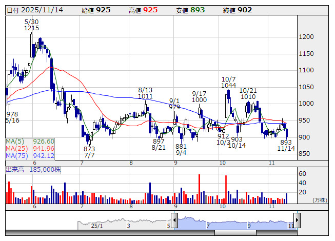 ユカリア <日足> 「株探」多機能チャートより11月14日引け後に、株主優待制度について発表した銘柄を取り上げた。