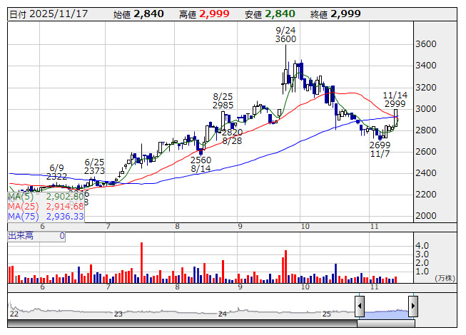 アジアQ <日足> 「株探」多機能チャートより同時に発表した第3四半期累計(1~9月)連結決算は、売上高36億6900万円(前年同期比27.5%増)、営業利益3億2100万円(同8.2%減)、純利益2億500万円(同11.0%減)だった。顧客からの旺盛なDX案件の引き合いを背景に売上高は大幅に伸長したものの、エンジニア数増加に伴う労務費・人件費、採用費の増加に加えて、オフィス拡張に伴う家賃など固定費の増加が利益を圧迫した。