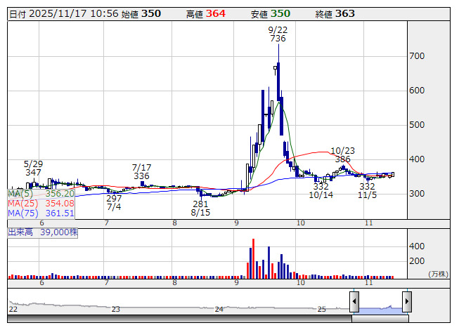 IGS <日足> 「株探」多機能チャートよりInstitution for a Global Society<4265>は14日、2026年3月期第2四半期(25年4月-9月)連結決算を発表した。売上高が前年同期比21.5%増の3.19億円、営業損失が0.46億円(前年同期は1.83億円の損失)、経常損失が0.34億円(同1.85億円の損失)、親会社株主に帰属する中間純損失が0.35億円(同1.86億円の損失)となった。