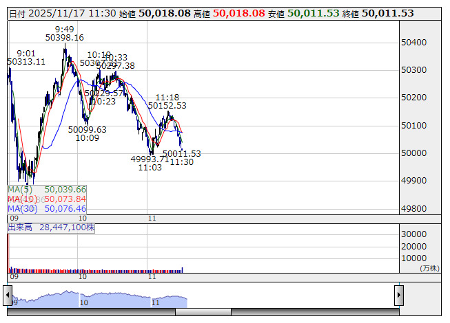 【市況】日経平均17日前引け=続落、365円安の5万11円