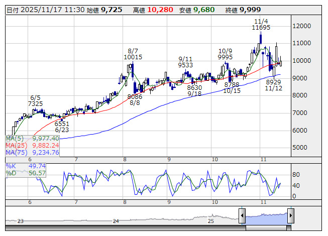 <5631> 日本製鋼所 9851 +317 ( +3.3%) 9709.8