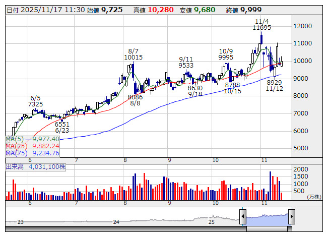 <5801> 古河電気工業 9999 +176 ( +1.8%) 9977.4 9882.2