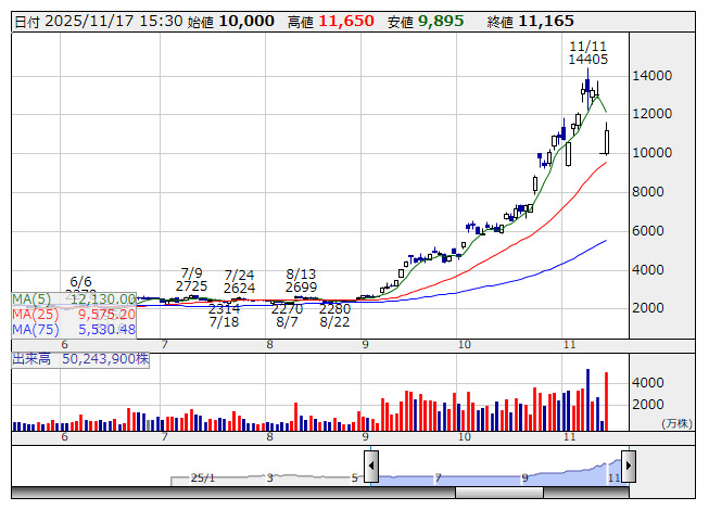 キオクシア <日足> 「株探」多機能チャートより●本日の約定回数増加率ランキング【ベスト50】