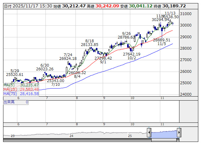2025年11月17日15時47分 【市況】JPX日経400先物:17日清算値=45ポイント安、3万160ポイント JPX日経400 <日足> 「株探」多機能チャートより 17日15時45分、JPX日経インデックス400先物期近2025年12月限は前週末清算値比45ポイント安の3万160ポイントで取引を終えた。出来高は2010枚だった。この日のJPX日経インデックス400の現物終値3万189.72ポイントに対しては29.72ポイント安。 株探ニュース