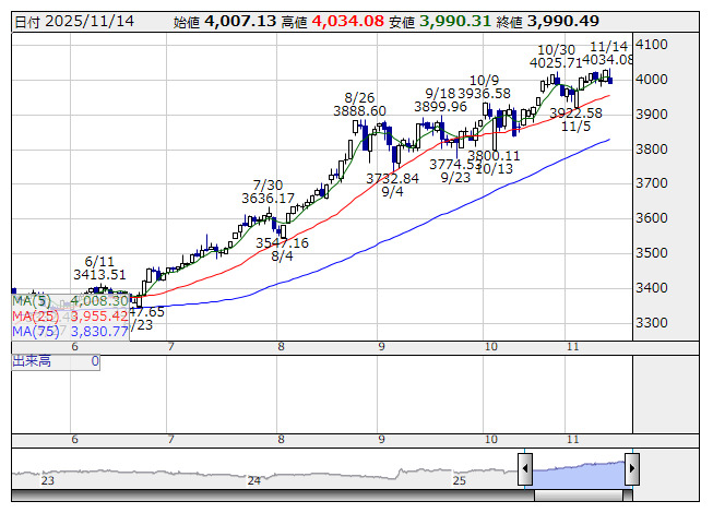 2025年11月17日16時40分 【市況】17日中国・上海総合指数=終値3972.0348(-18.4573) 上海総合 <日足> 「株探」多機能チャートより 17日の中国・上海総合指数の終値は前営業日比18.4573ポイント安の3972.0348と続落。 出所:MINKABU PRESS