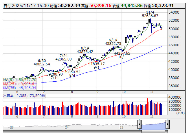 前週末14日の米国市場はまちまち。人工知能(AI)バブル懸念から利益確定売りが継続し、利下げ期待の後退も更なる売り材料となった。その後、値ごろ感からハイテクが買い戻され、ナスダックは上昇に転じた。ダウも下げ幅を縮小したが、まちまちで終了。米株式市場の動向を横目に、17日の日経平均は94.14円安の50282.39円と続落して取引を開始した。寄り付き時点では売り優勢のスタートとなったものの、買い戻し圧力もやや強まり下げ幅を縮小する場面も見られた。ただ、その後はマイナス圏での軟調もみ合い展開となった。米追加利下げ観測が後退して全体的な高値警戒感が強まるなか、中国政府が日本への渡航を控えるよう注意喚起したのを受けて日中関係の悪化懸念も台頭、投資家心理は悪化している。そのほか、今週は19日にエヌビディアの決算が予定されていることもあり、手掛けにくさが意識されやすかった。
